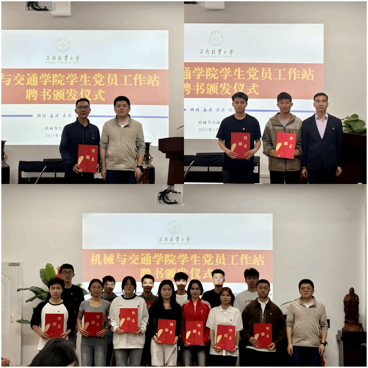 6月25日,机械与交通学院举行学生党员工作站聘书颁发仪式。学院党委书记马锐、党委副书记陈继飞出席仪式并致辞。学院各党支部书记、学生党员工作站部分成员参加。