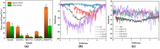 图2 微弧氧化处理前后各试样体积磨损率及磨损深度曲线
