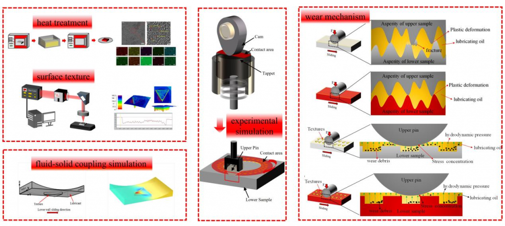 近日,星空体育登录网页入口2020级硕士研究生王泽霄在陈文刚教授的指导下以第一作者身份在《Tribology International》期刊(中科院一区,TOP期刊)上发表题为《Surface texture and heat treatment on the friction performance of cam tappet experimental and fluid-solid coupling numerical study》的学术论文,该论文通过线接触式摩擦磨损试验,揭示了热处理与表面织构协同作用对凸轮挺柱摩擦特性的影响,并分析了其减摩机理。研究结果为凸轮挺柱摩擦副的减摩设计提供了新的视角。